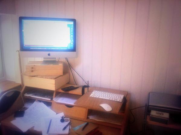 Knackered a knee ligament last week. Now improvised a standing desk with plywood, 2 clamps and 2 wine boxes.